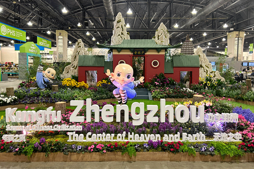 本次费城花展将自然之美、艺术之韵和人类之智巧妙融合,展现出前所未有的澎湃活力。花香袭人,沁人心脾,来往的游客在各个展位流连忘返。在繁花似锦的展园内,郑州的展位尤为引人注目。以“功夫郑州·花俏嵩山”为主题,巧妙地以嵩山与少林寺的雄伟山川为背景,融入月季、牡丹等中国传统名花,展现出别具一格的东方风情,独具匠心,令人陶醉。世界各地的游客驻足在郑州展位前,感叹中国之美、郑州之美。