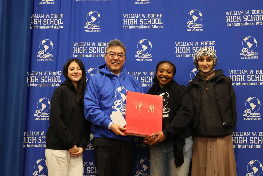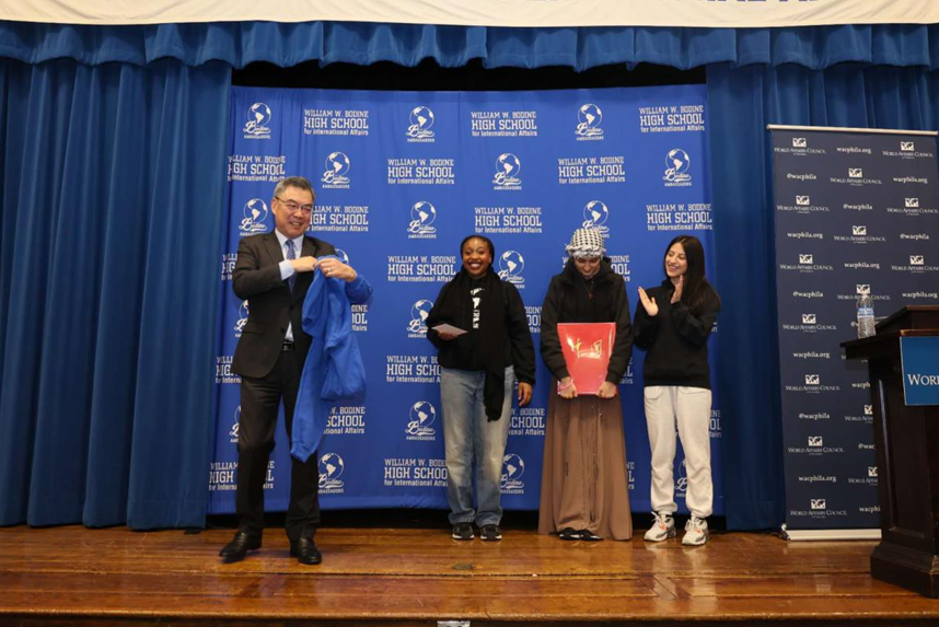 金秋十月,天高气爽。10月19日下午,中国驻纽约总领馆总领事黄屏赴宾夕法尼亚州费城市走访威廉·博丁国际事务高中,亲切会见校领导,同师生代表齐聚一堂,发表热情洋溢的演讲,与同学们倾情互动交流、答疑释惑,并代表中国驻纽约总领馆向学校赠送中国历史文化书籍。钱进副总领事,该校校长米切尔、副校长托斯曼,费城世界事务理事会教育事务副总裁哈钦森、教育主管沃纳,美中商旅总会会长张文龙、秘书长Gloria Li及该校逾百名师生代表参加有关活动。