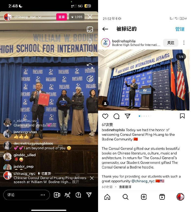 黄屏总领事还就美涉华舆论和认知、亚裔在美生存发展等回答同学们提问,并代表总领馆向学校赠送精美的中国历史文化书籍。在热情高涨的欢呼与掌声中,黄屏当场穿上印有校徽和校名的纪念衫,将全场气氛推向高潮,很多学生情不自禁地表示为中国外交官的儒雅、自信、开放和接地气“打Call”。我馆并通过社交媒体照片墙全程直播演讲盛况,吸引上千位粉丝同步在线观看并纷纷好评。该校官方照片墙账号亦同步发布演讲推送,收获众多点赞。