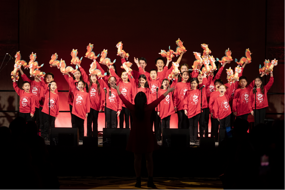 活动在洋溢着浓郁中国风的春节动态海报展映中隆重开幕。中美特色文化元素在晚会现场交织跃动,来自多个国家不同文明的艺术家们呈现了一场精彩纷呈、令人耳目一新的文化盛宴。纽约市儿童合唱团用中英双语分别演唱中美经典曲目《茉莉花》《我那微小的光》。黄野乐队演奏的《康定情歌》彰显传统与现代民族元素的融合。The Honey Taps献上轻快活跃的舞蹈《金色的快乐舞步》,并与嘉宾共同上演魔幻舞步。少年钢琴家丁一迪演奏《春之声圆舞曲》,美歌手肯奇献唱《All of Me》《Dat's Love》。来自不同国家的青少年用英语、西班牙语、俄语等语言献上龙年新春祝福。国风时装秀惊艳全场,将晚会推向高潮。整场活动在铿锵有力的儿童合唱《龙的传人》中落下帷幕。